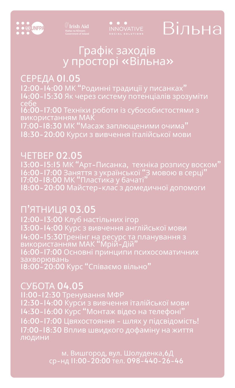 Цього квітневого тижня і у просторі "Вільна" у Вишгороді можна зайнятися монтажем-відео,бачатою, психологічними практиками? пограти в настільні ігри та інше.