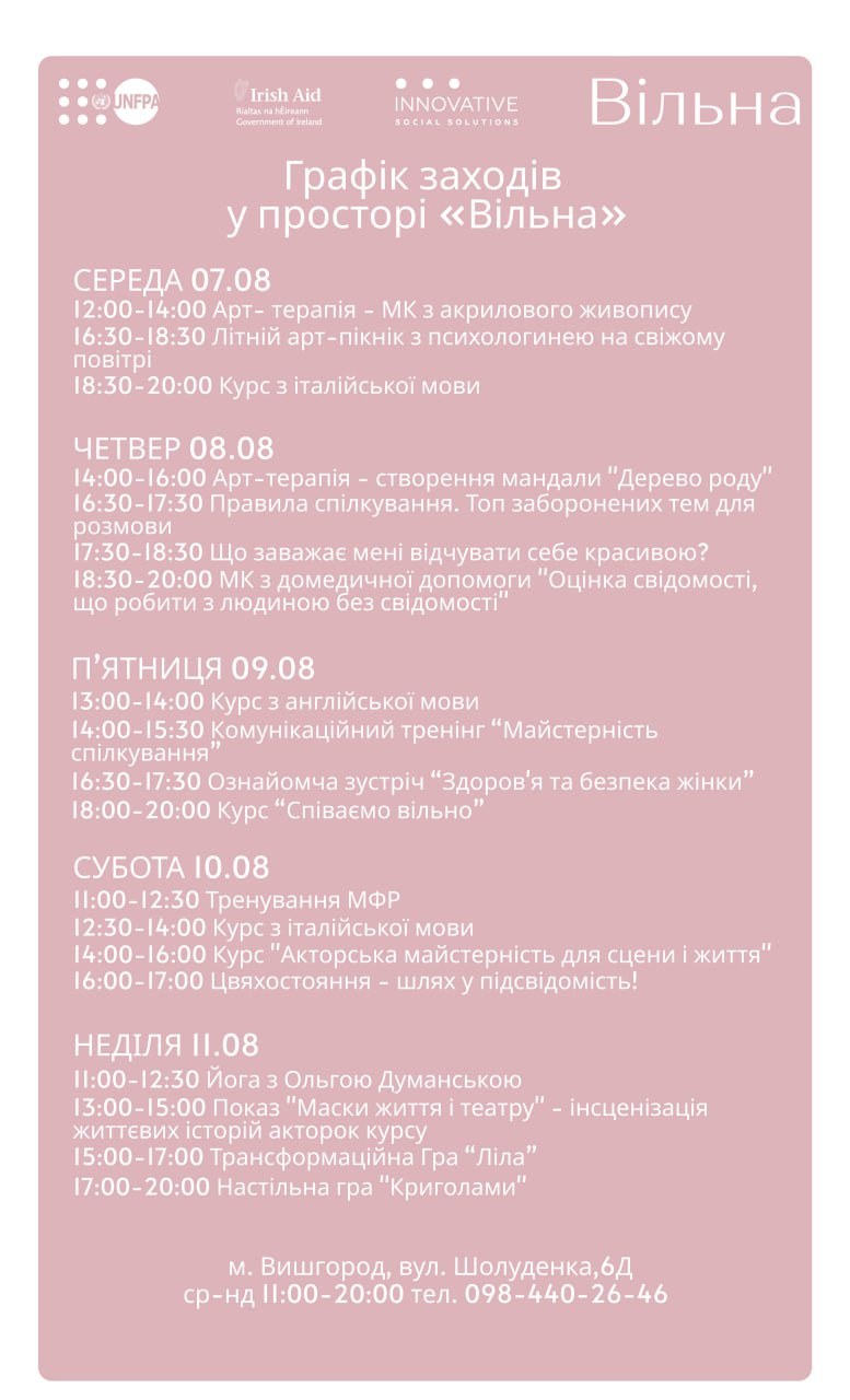 Цього тижня і у просторі "Вільна" у Вишгороді можна пройти тренінг з акторської майстерності, потрапити в психологічну групу сімей військових, зайнятися вивченням італійської та англійської мов у Вишгороді.