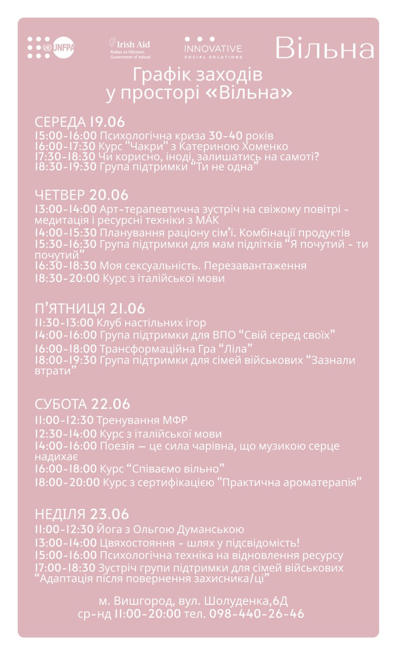 Цього червневого тижня і у просторі "Вільна" у Вишгороді можна пройти ароматерапевтичний курс, потрапити в психологічну групу сімей військових, зайнятися живописом у Вишгороді, або поспівати.