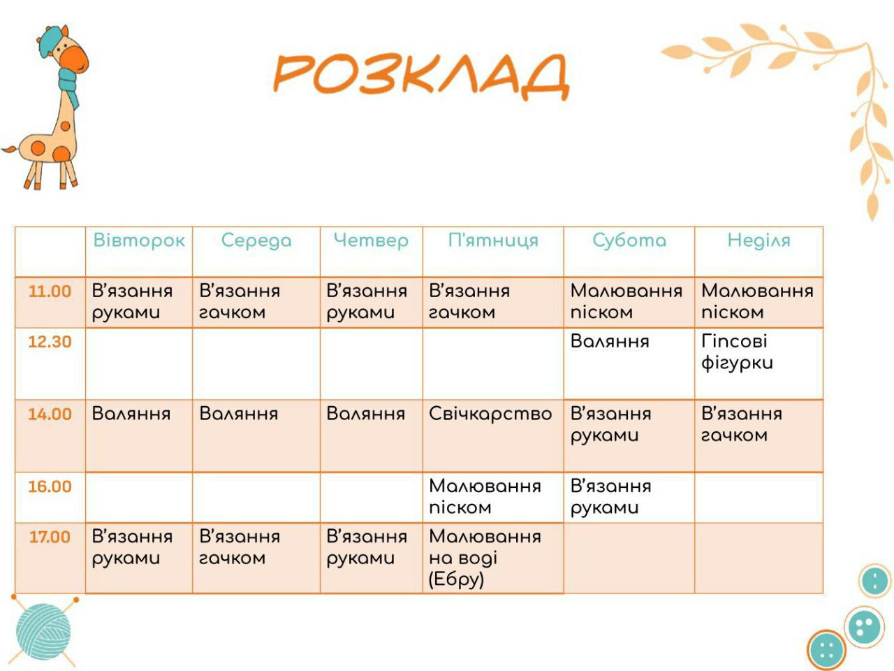 2-7 ВЕРЕСНЯ ЗАХОДИ ЦЬОГО ТИЖНЯ У "МАЙСТЕРНІ ЖИРАФИ ЛІЛІ" У ВИШГОРОДІ