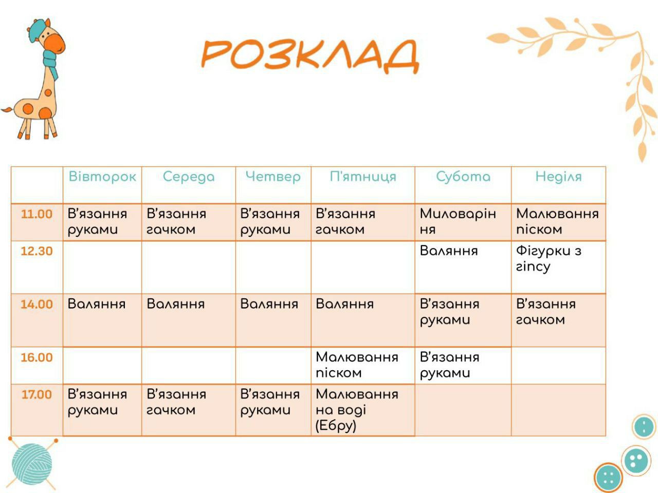 22-27 ЛИПНЯ ЗАХОДИ ЦЬОГО ТИЖНЯ У "МАЙСТЕРНІ ЖИРАФИ ЛІЛІ" У ВИШГОРОДІ