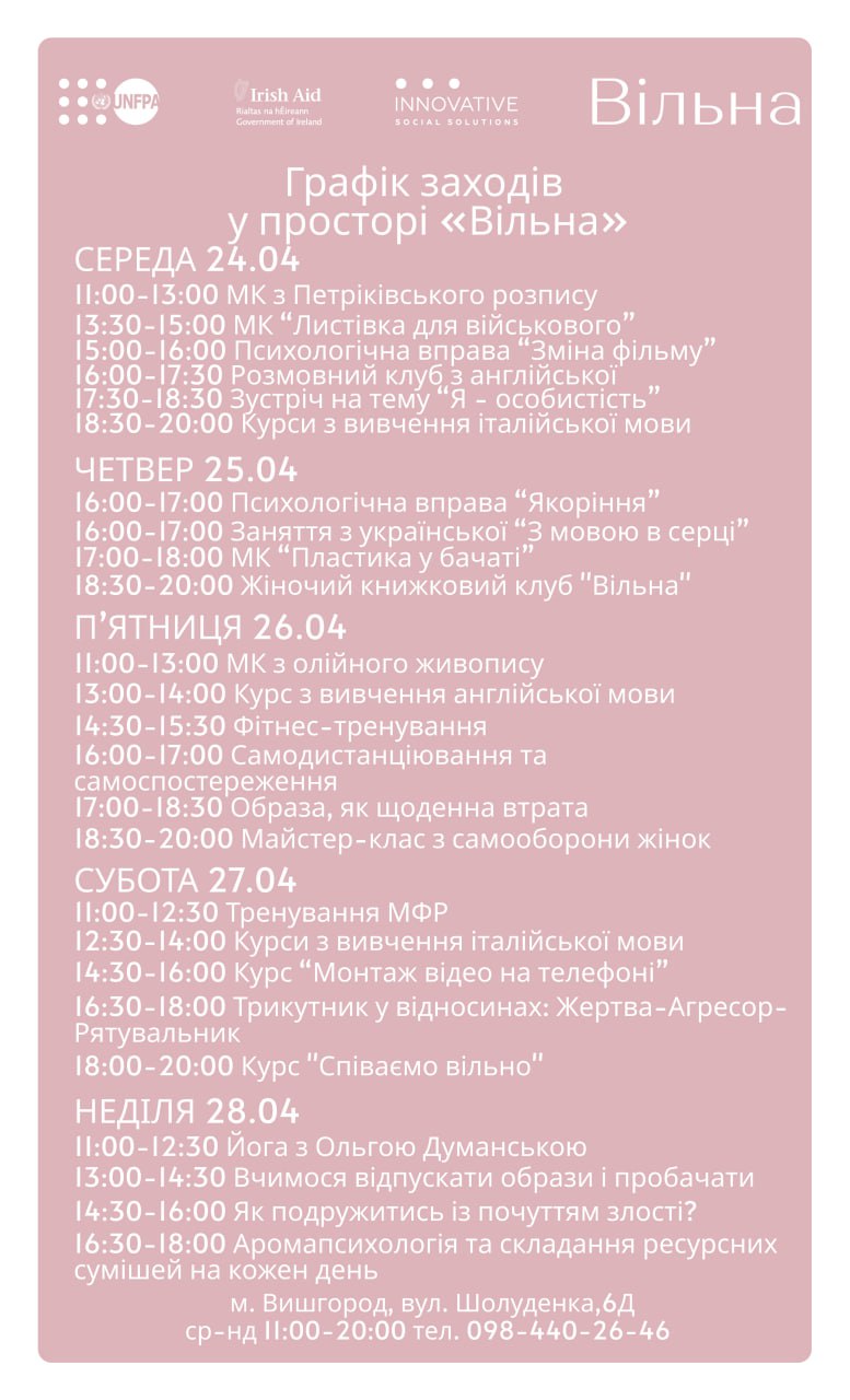 Цього квітневого тижня і у просторі "Вільна" у Вишгороді можна зайнятися монтажем-відео, самообороною,бачатою, психологічними практиками.