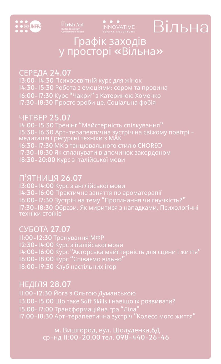 24-28 ЛИПНЯ ПСИХООСВІТНІЙ КУРС, ТАЙМ-МЕНЕДЖМЕНТ, ФІНАНСОВА ГРАМОТНІСТЬ ДЛЯ ЖІНОК У ПРОСТОРІ "ВІЛЬНА" У ВИШГОРОДІ