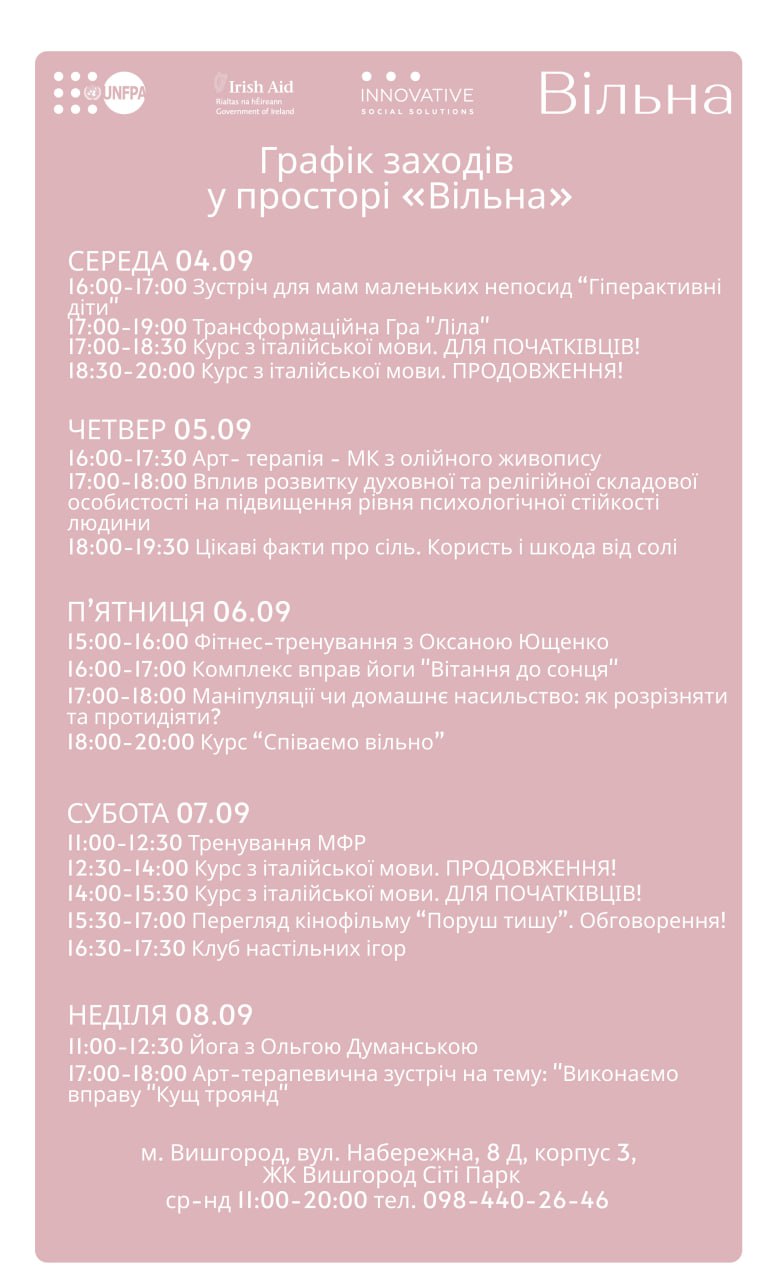Цього тижня і у просторі "Вільна" у Вишгороді можна звернутися за психологічною допомогою, пограти в трансформаційні ігри, зайнятися медитацією та багато іншого.