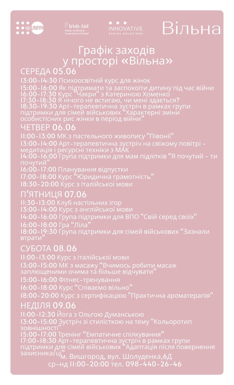 Цього червневого тижня і у просторі "Вільна" у Вишгороді можна поспівати, пройти психосовітній курс, отримати освітній сертифікат з ароматерапії у Вишгороді.
