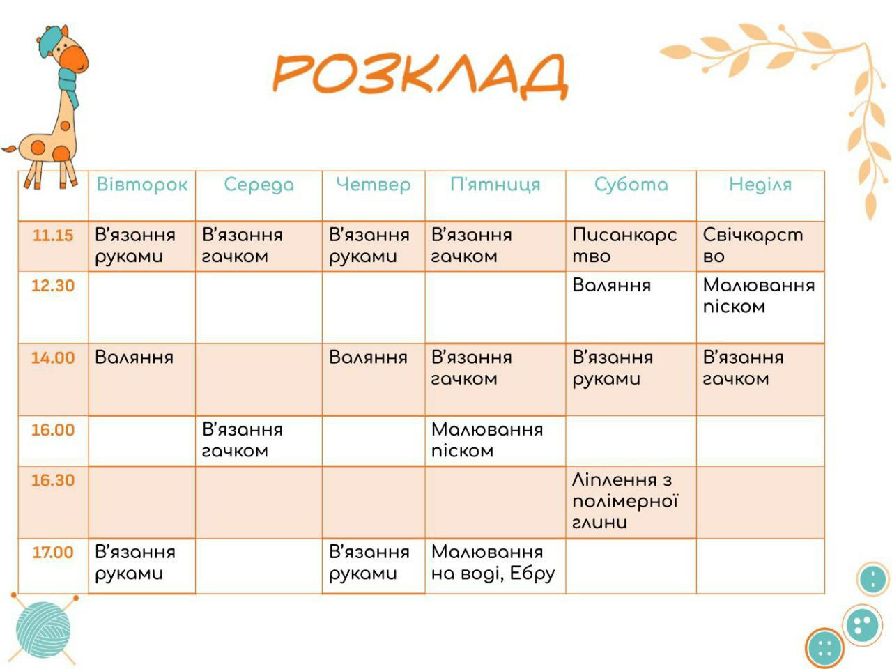 8-13 КВІТНЯ ЗАХОДИ ЦЬОГО ТИЖНЯ У "МАЙСТЕРНІ ЖИРАФИ ЛІЛІ" У ВИШГОРОДІ