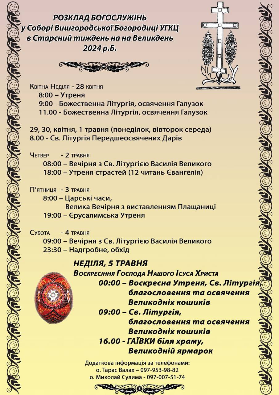 Розклад Богослужінь на Страсний Тиждень та Великдень 2024 року у Соборі Вишгородської Богородиці УГКЦ у Вишгороді можна побачити на картинці нижче