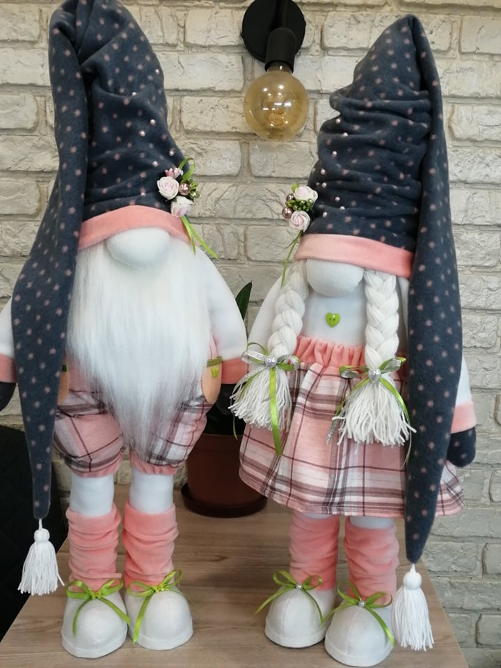 Для замовника можна виконати будь-яке кольорове та тематичне рішення. Гномики можуть бути новорічні, весняні, з пасхальними елементами, просто у кольорах вашого інтер'єру, як подарунок на річницю весілля або день народження. Висота іграшок 70 см (можливі інші розміри на замовлення), стоять впевнено.