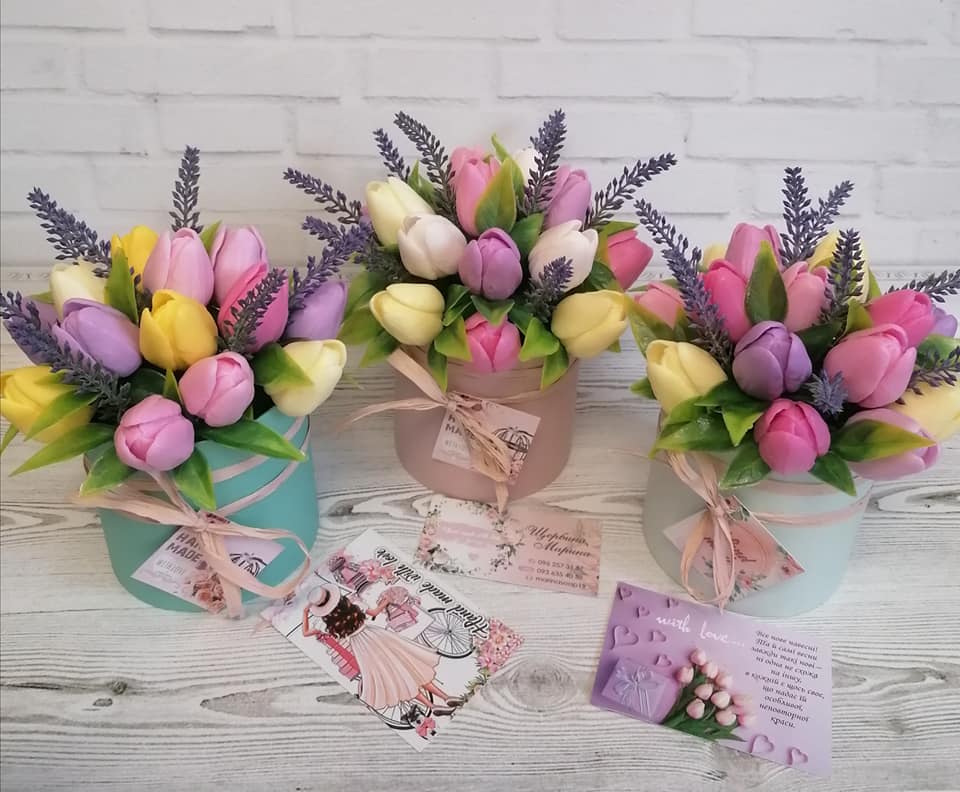 Доброго дня. Мене звати Щербина Марина, я займаюся миловарінням з основи, зокрема віддаю перевагу мильній флористиці. Композиції з мила ручної роботи - чудовий подарунок, який неодмінно подарує приємні емоції, адже має естетичний вигляд та приємний аромат, до того ж радуватиме не один рік. За бажанням милко можна використати і за призначенням - користуюсь лише якісними компонентами. Подарунки з мила готую на різний смак та гаманець, виконую корпоративні замовлення. Незабаром чарівне жіноче свято весни, тому я потурбувалася про те, щоб кожен мав змогу привітати свою подругу, співробітницю, вчителів, вихователів лікарів, - всіх - всіх близьких серцю жінок та дівчаток.