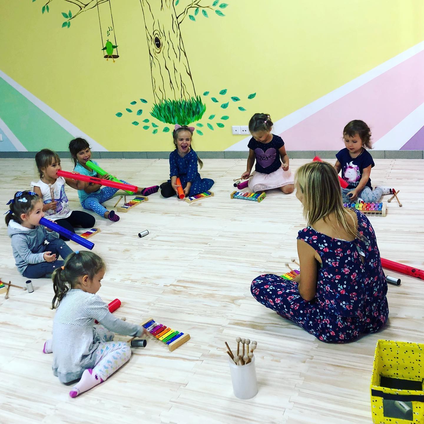 Музичні розвиваючі заняття в студії "Фасолька" наповненні музичним супроводом, танцями, підручними матеріалами, справжніми інструментами, адаптованими під вік.